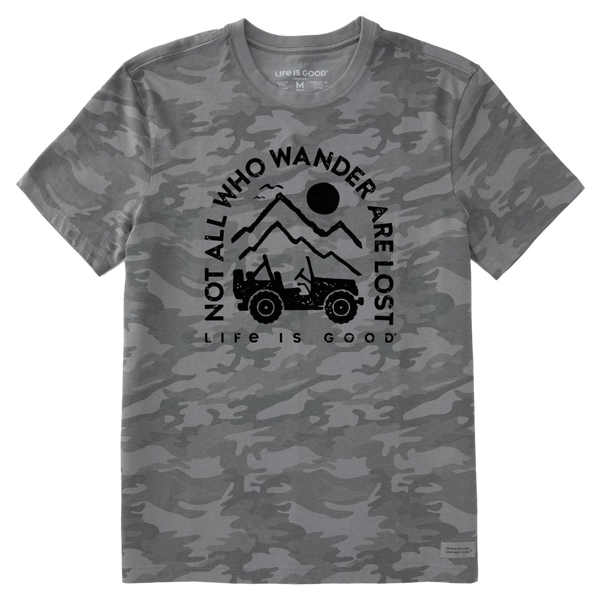 For those who love a rugged look. our Men's Short Sleeve Allover Print Crusher Tee has you covered with a subtle grayscale camo pattern fully printed on the front. back. and sleeves.