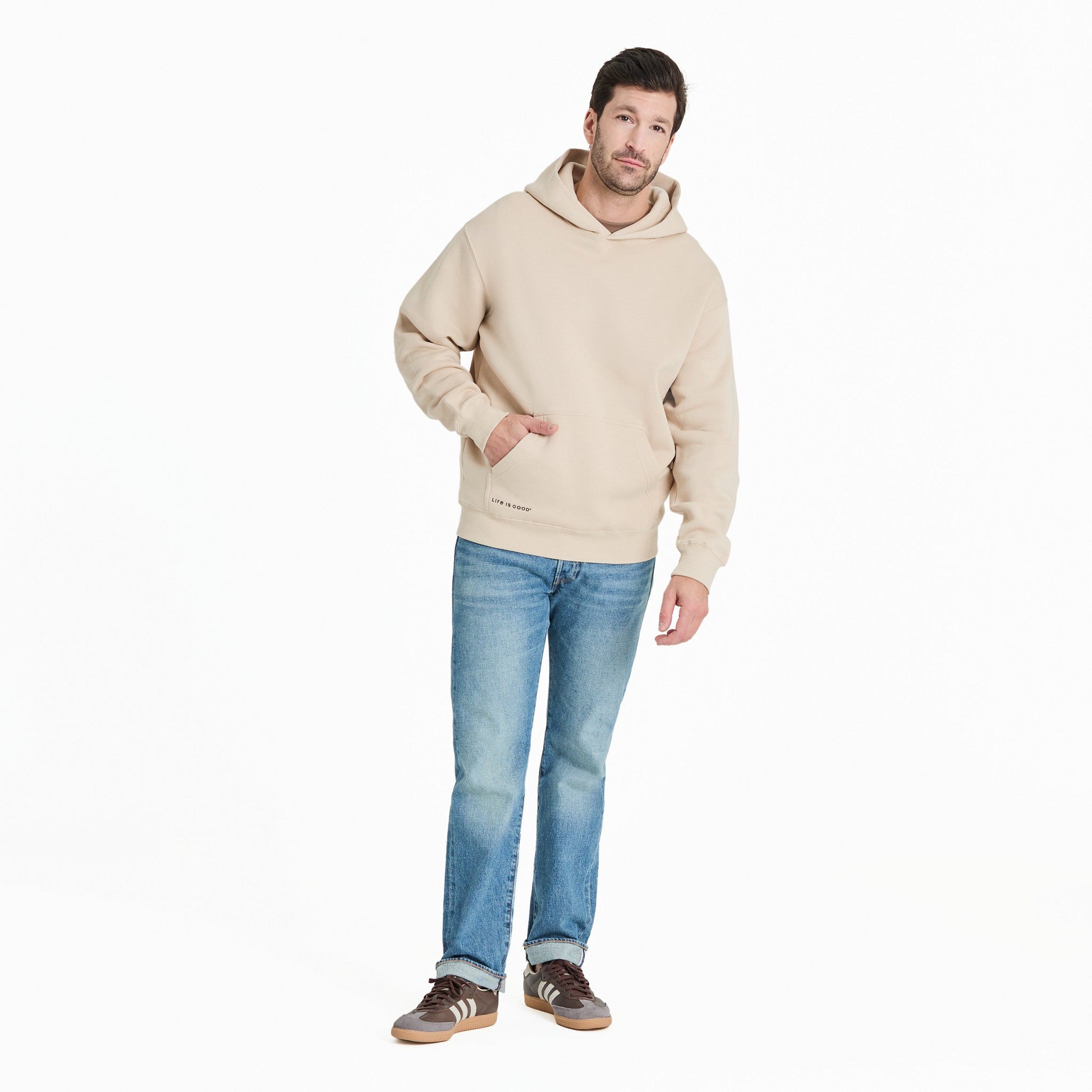 You may notice this hoodie is a little larger than usual—it will shrink to the standard Life is Good fit you know and love after washing!