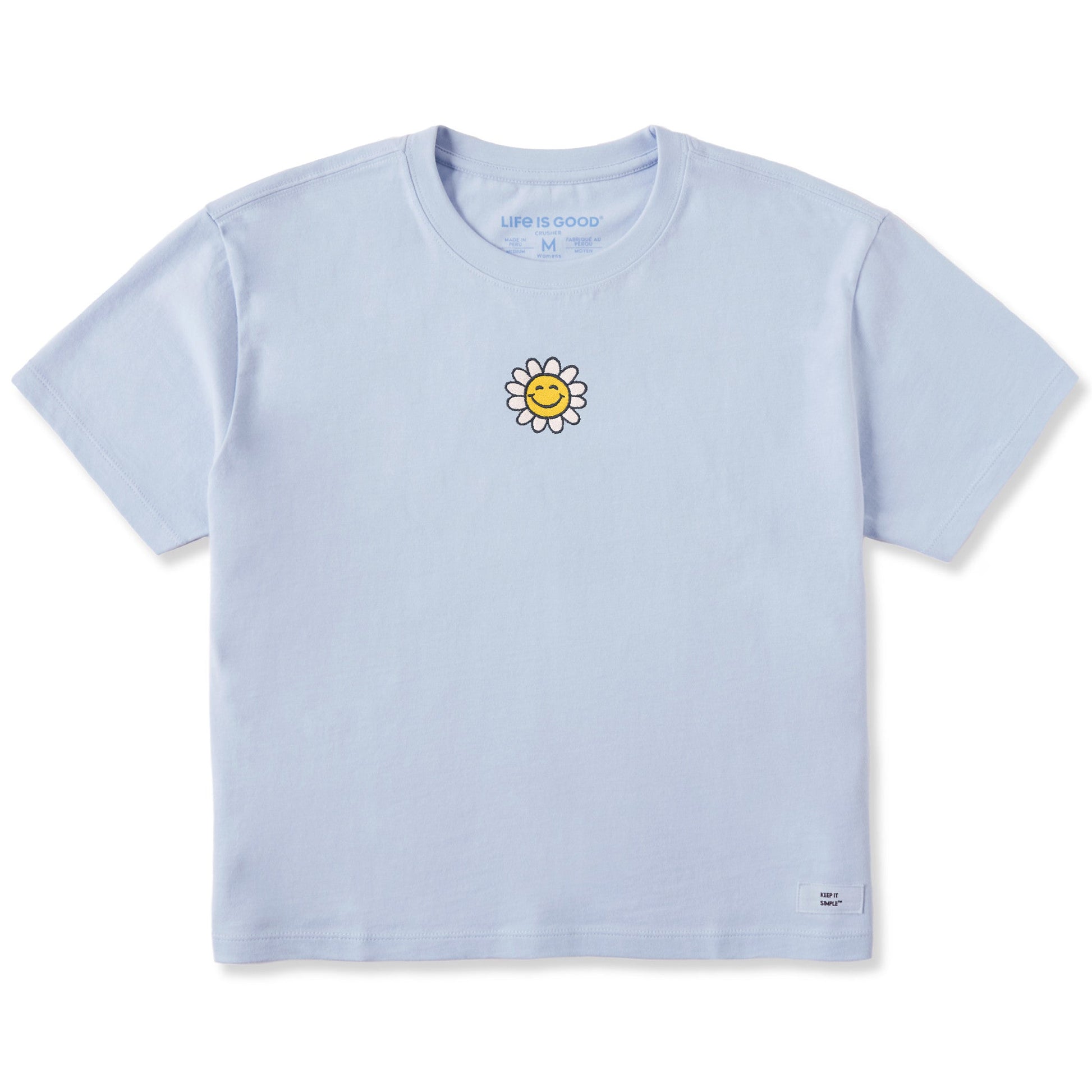 Women's Embroidered Smile Daisy Short Sleeve Crusher Boxy Tee