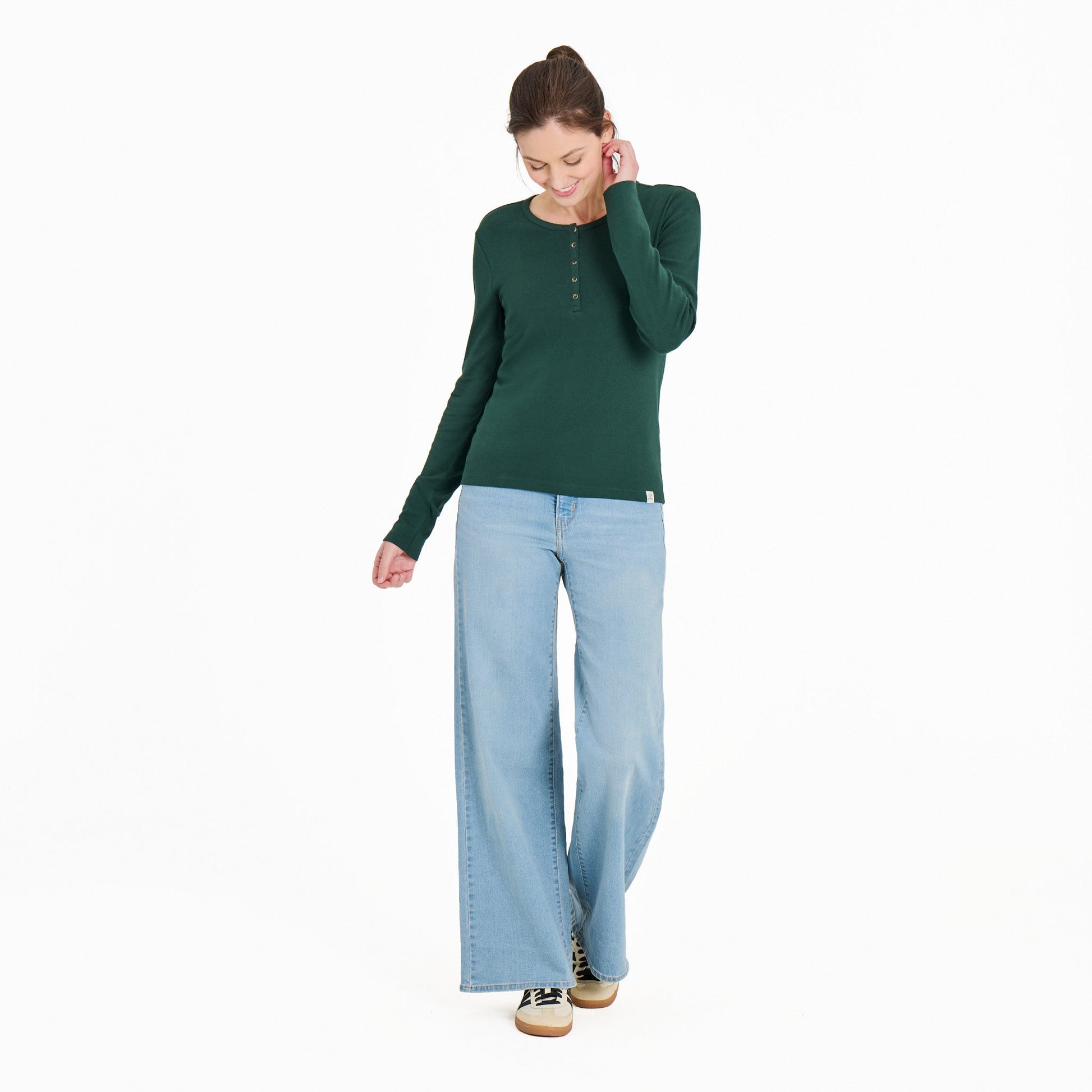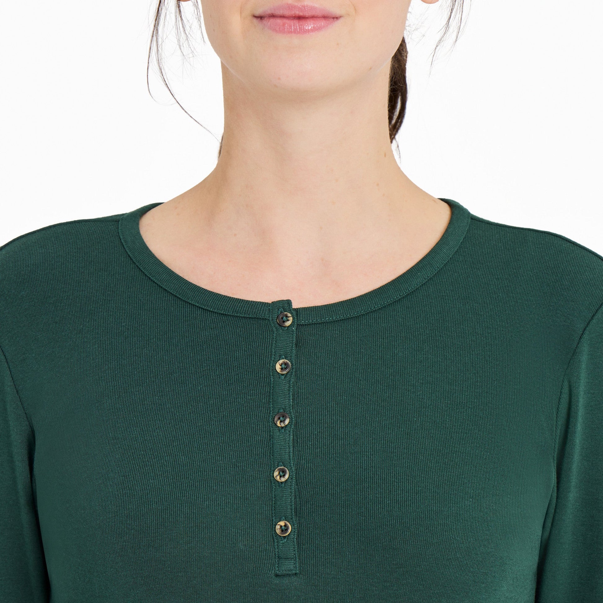 - Self-fabric functional button up henley opening with small faux horn buttons.
